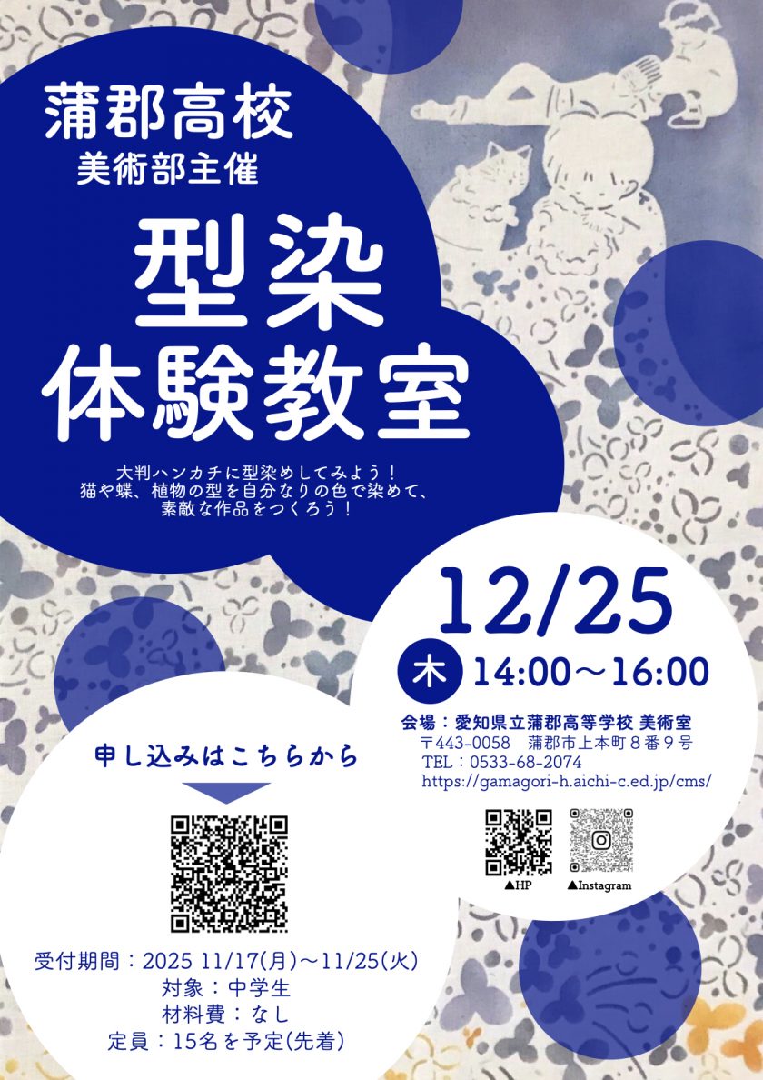 本校美術部主催の型染体験教室を、中学生の皆さんを対象に行います。 【蒲郡高校美術部主催 型染体験教室】 日時:令和7年12月25日(木) 14:00~16:00