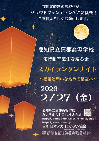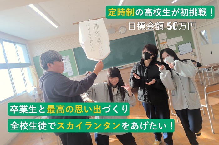 「卒業する4年生とともに最高の思い出づくりを!」との思いから、全校生徒でスカイランタンを打ち上げるための費用を集めるため、クラウドファンディングに挑戦します。愛知県の定時制高校では初めての試みです!